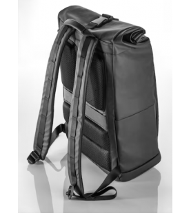 Sac à dos roll-top Classe G. Noir. Extérieur en polyester recyclé. Doublure intérieure en polyester recyclé avec Mercedes-Benz Pattern. Tirette de fermeture éclair et poignée dans le cuir de la Classe G. Sangles d'épaule rembourrées et éléments dorsaux en mesh. Grand compartiment principal, compartiment pour ordinateur portable (15 pouces), plusieurs compartiments intérieurs. Poche avant avec badge dans le design du cache de roue de secours de la Classe G. Dimensions : env. 17 x 30 x 50 cm (déroulé env. 63 cm).